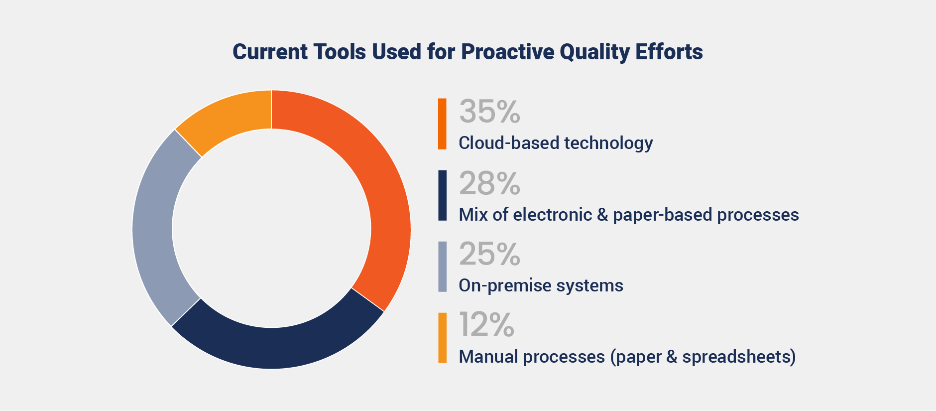 However, fragmented systems are limiting progress. While 35% of organizations use cloud-based technology to support proactive quality, others rely on less efficient tools such as on-premise systems (25%) or a mix of electronic and paper-based processes (28%)