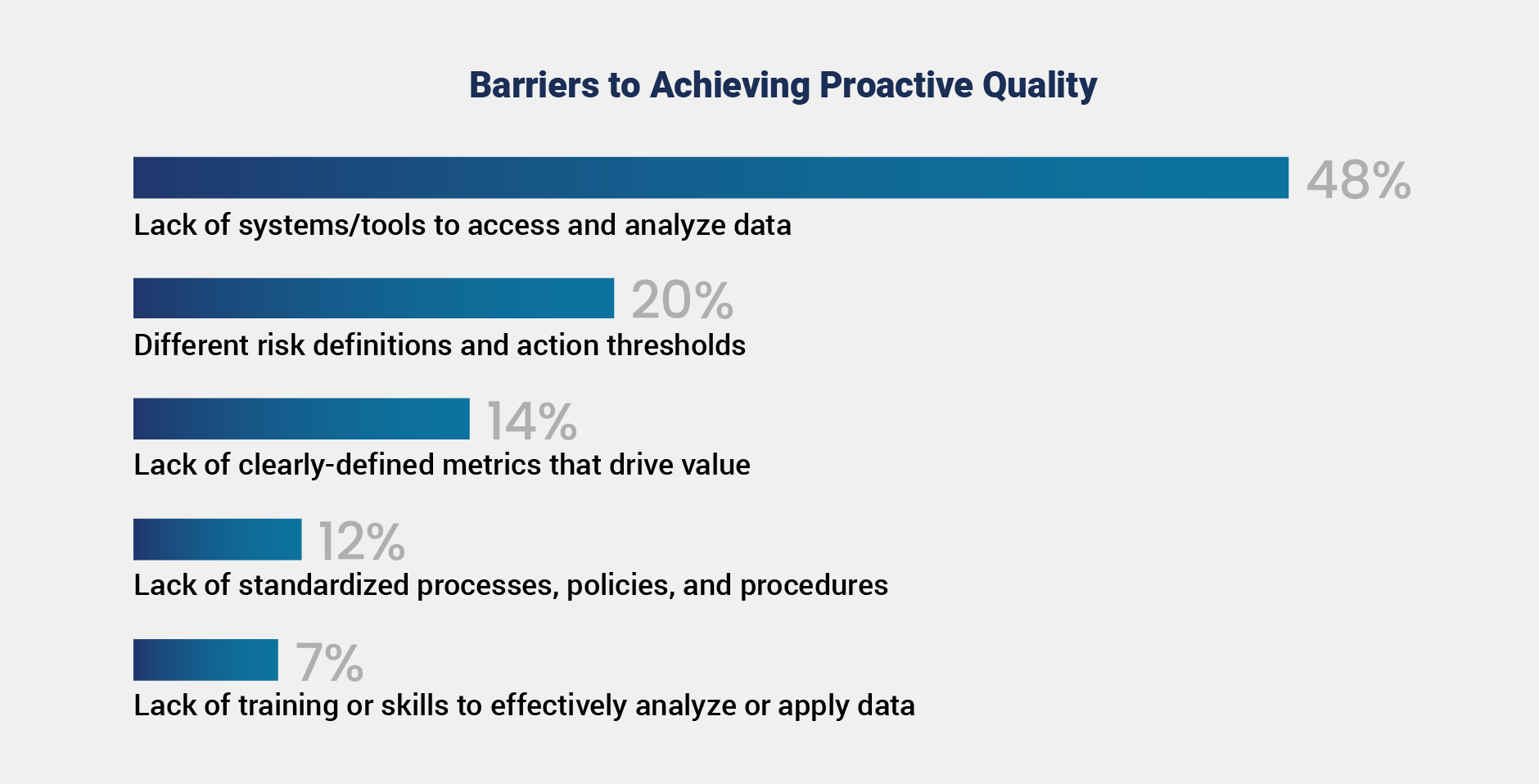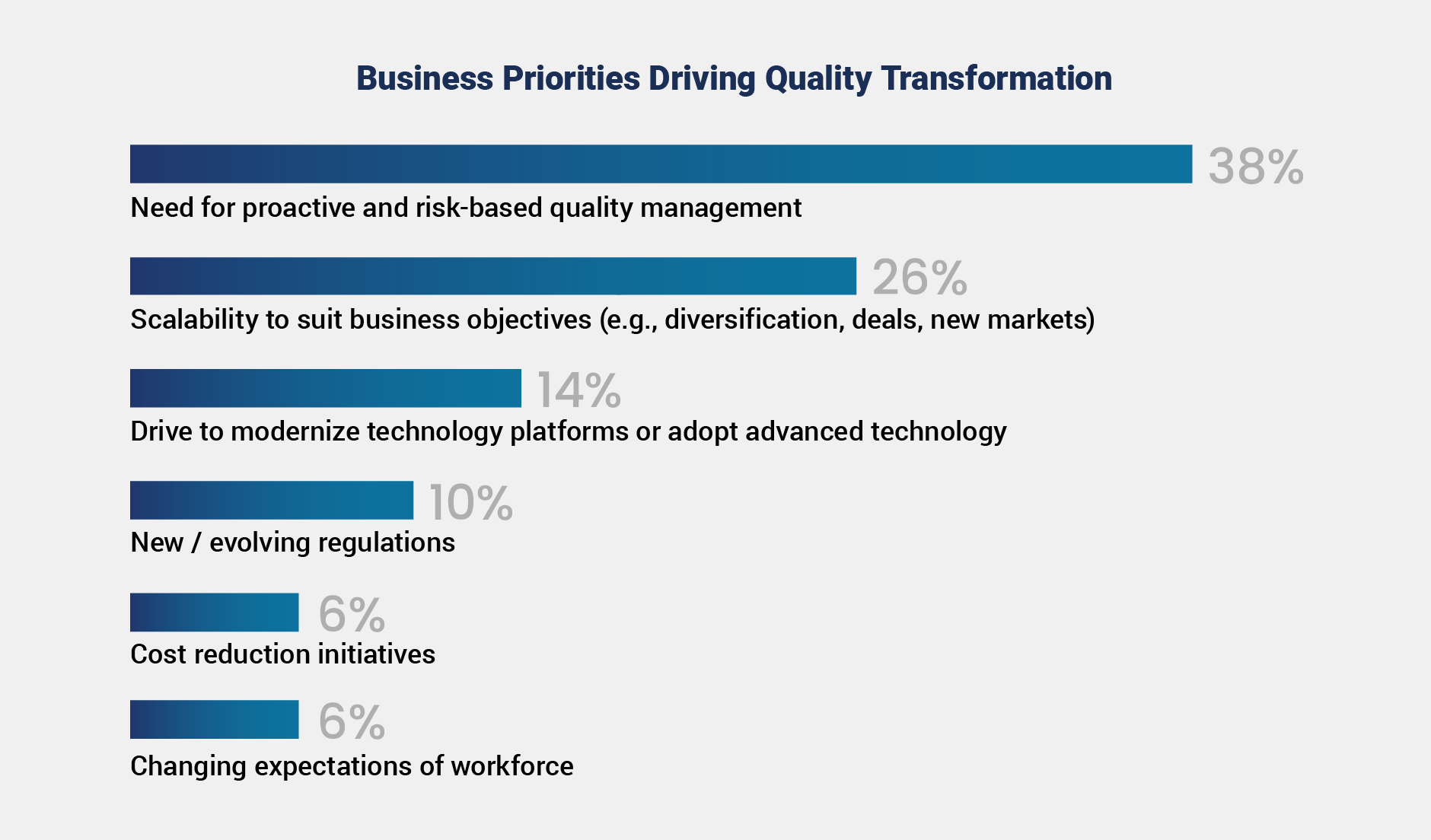 Interestingly, while regulatory changes can act as catalysts for transformation, this factor ranked lower in priority, with just 10% of respondents citing evolving regulations. This finding suggests the industry is seeking to stay ahead of regulatory changes rather than react to them, underscoring the importance of readiness and proactive quality strategies.
