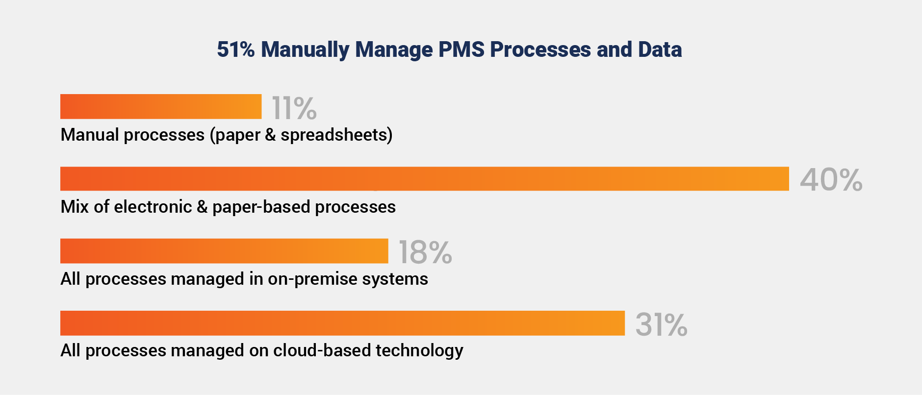 While many medtech organizations are focused on quality transformations, technology adoption to support these efforts remains limited. Over half (51%) of responding companies still rely on manual or partially manual processes to manage postmarket quality.