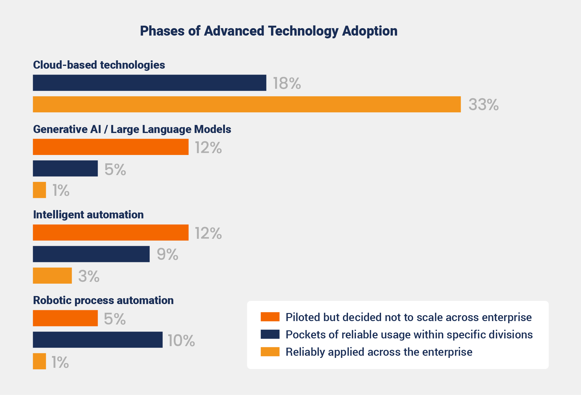 In fact, the study shows that 60% of surveyed organizations currently in transformation are already reliably using cloud-based technologies across the enterprise, with another 17% applying it in select areas.