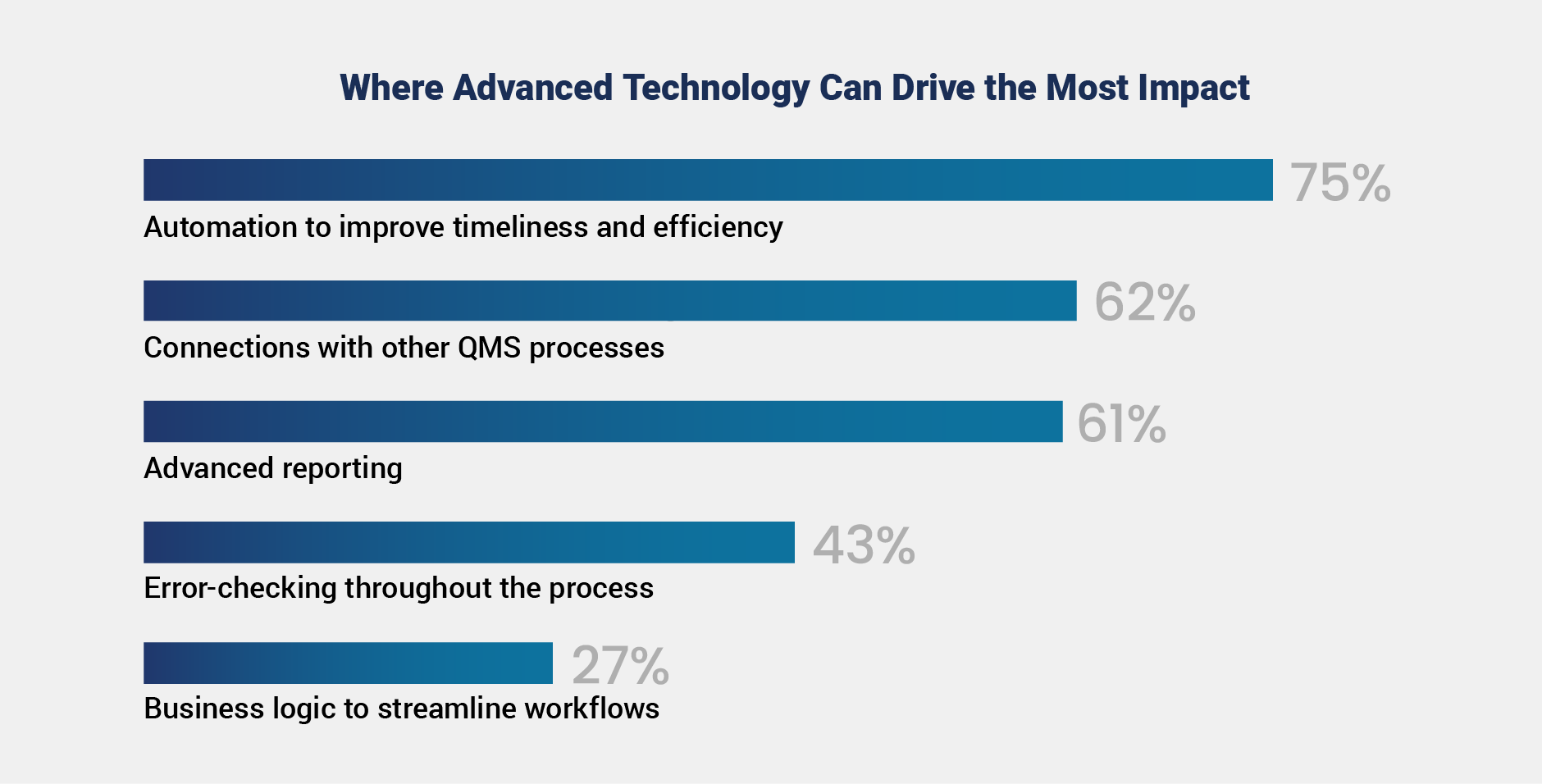 Despite limited adoption, there is strong optimism about the potential of advanced technologies to improve postmarket quality. Respondents identified automation to improve timeliness and efficiency (75%), connections with other QMS processes (62%), and advanced reporting to support data-driven decisions (61%) as top areas for impact. Data indicates less focus on use cases of error-checking and improving business logic to streamline workflows.