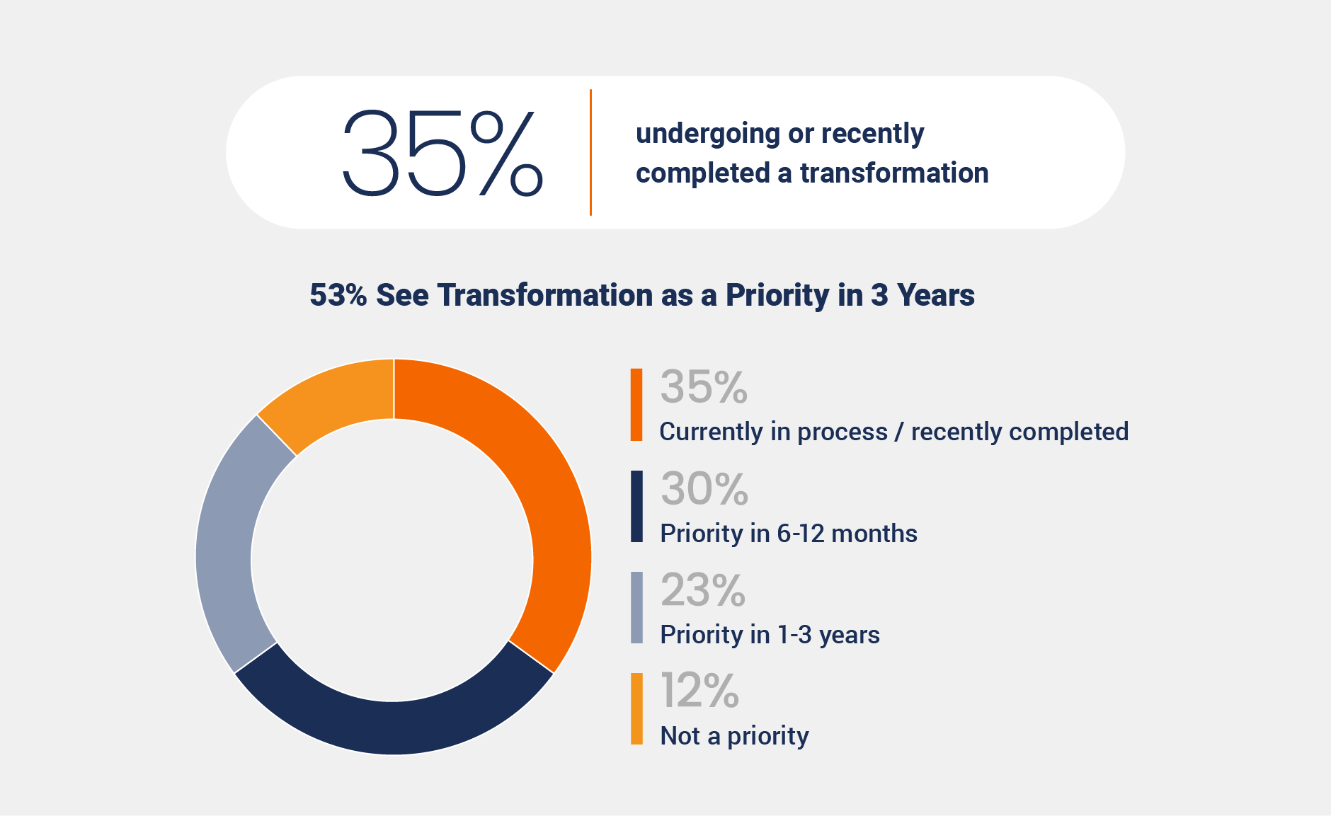 Thirty-five percent of respondents indicate they are currently undergoing or have recently completed a postmarket quality transformation, while more than half (53%) are planning for transformation in the short-term.