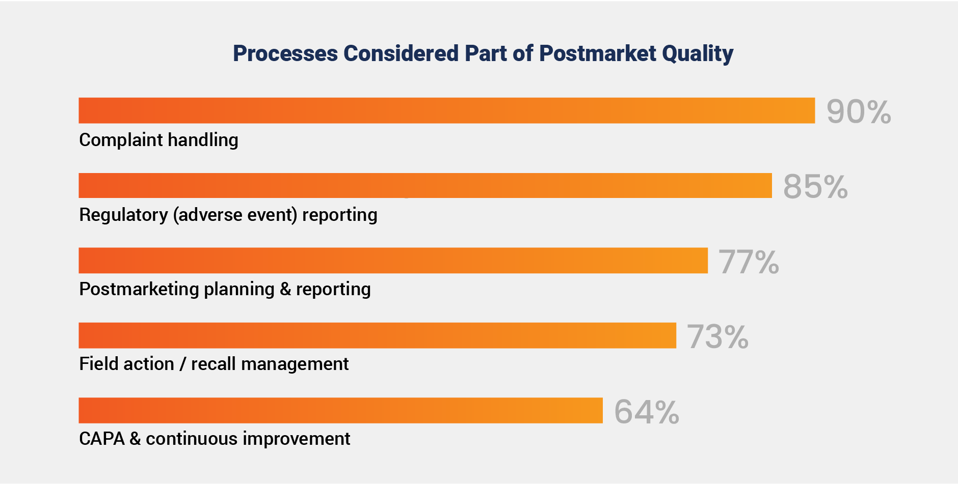 A vast majority of medtech companies align on a core definition of postmarket quality focused on surveillance, reporting, and recalls, with 90% of respondents citing complaint handling as essential.