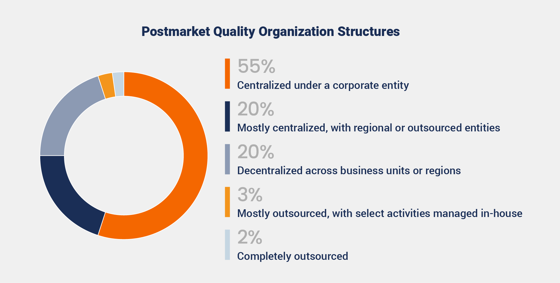 The study reveals that 55% of responding organizations take a centralized approach to postmarket quality, enabling standardization, efficiency, and resource optimization. In contrast, 20% operate with decentralized models, offering flexibility but risking inconsistencies without robust systems.