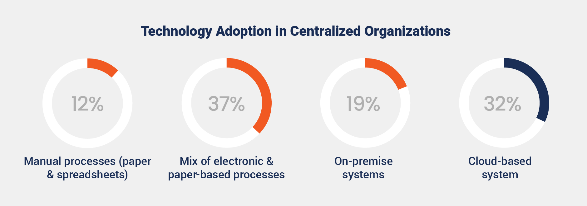 While centralization offers consistency, many organizations still rely on outdated technology. Among those with centralized or mostly centralized approaches, 68% of those surveyed are not using modern cloud-based systems.