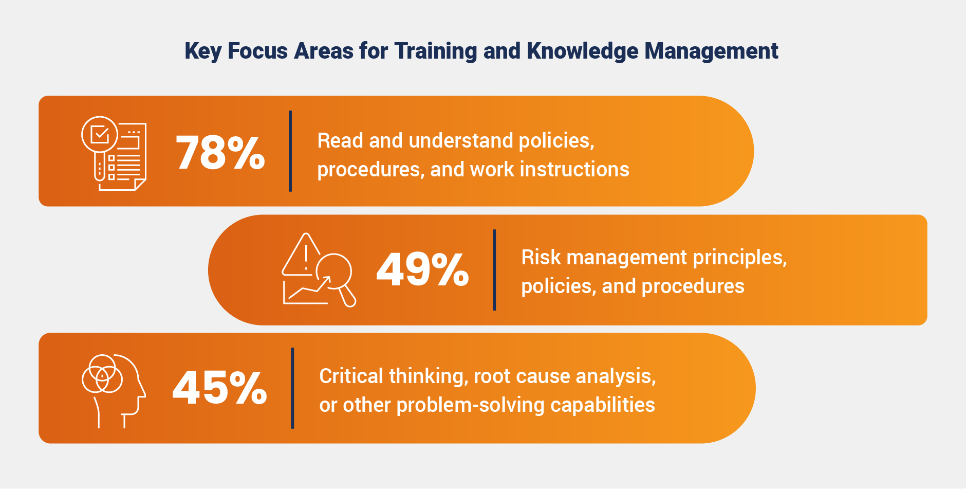 Training and knowledge management programs are heavily focused on reviewing policies, procedures, and work instructions, with nearly 80% of surveyed organizations prioritizing this area. This focus far outweighs other key areas such as risk management and problem-solving skills, revealing a potential gap in training programs. By placing greater emphasis on developing critical thinking and risk-based decision-making skills, organizations may better equip teams to manage postmarket challenges and improve product quality.